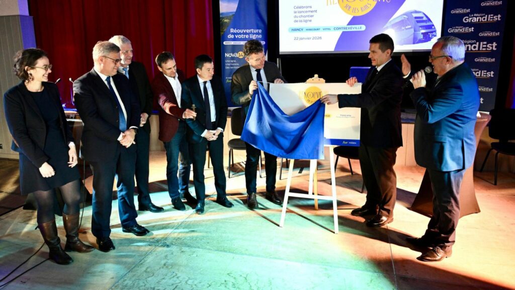 Le 22 janvier le chantier de la ligne Nancy-Contrexéville a été officiellement lancé. Franck Leroy, Président du Conseil Régional de la région Grand Est, en présence d’élus et des représentants des parties impliquées dans le projet a donné le coup d’envoi à Mirecourt, sur le site de maintenance et de remisage (SMR) futur cœur opérationnel de la ligne.