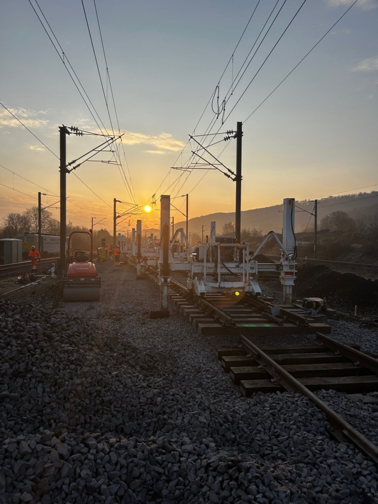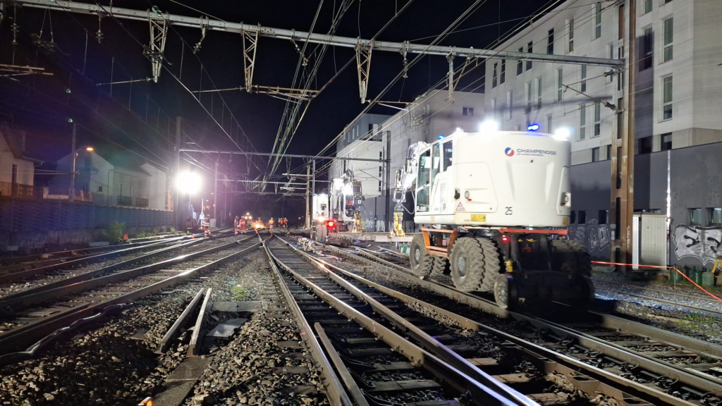 ETF (mandataire) a effectué principalement de nuit, le remplacement de 7 appareils de voie et d’1 kilomètre de voie. Cependant le Week-end, 5 OCP consécutives ont été nécessaires, les quatre premières mobilisant les équipes en continu pendant 36 heures, la dernière estimée à 16 heures a permis de remplacer un grand appareil de voie.